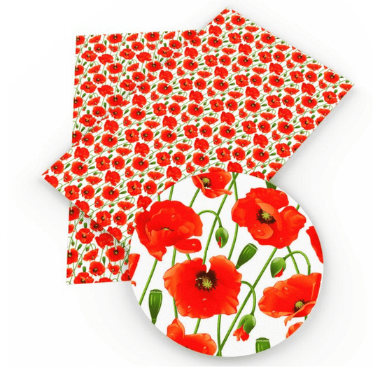 20*30cm Small Red Poppies Flowers White Background Printed Leatherette, Sold in sheet